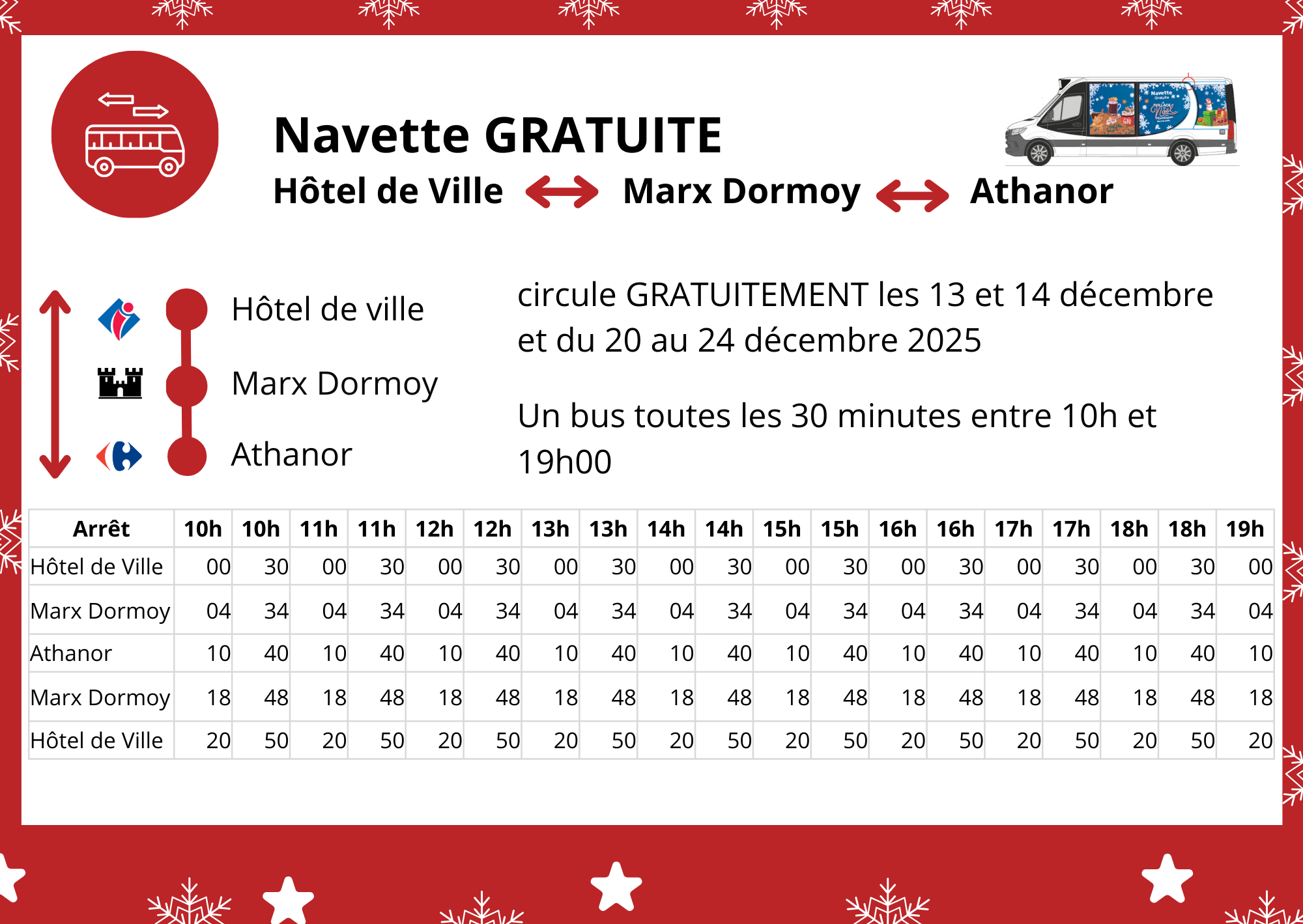 Une navette gratuite circulera à Montluçon, entre les arrêts Hôtel de Ville et Athanor, toutes les 30 minutes de 10h à 19h les 13 et 14 décembre puis du 20 au 24 décembre.